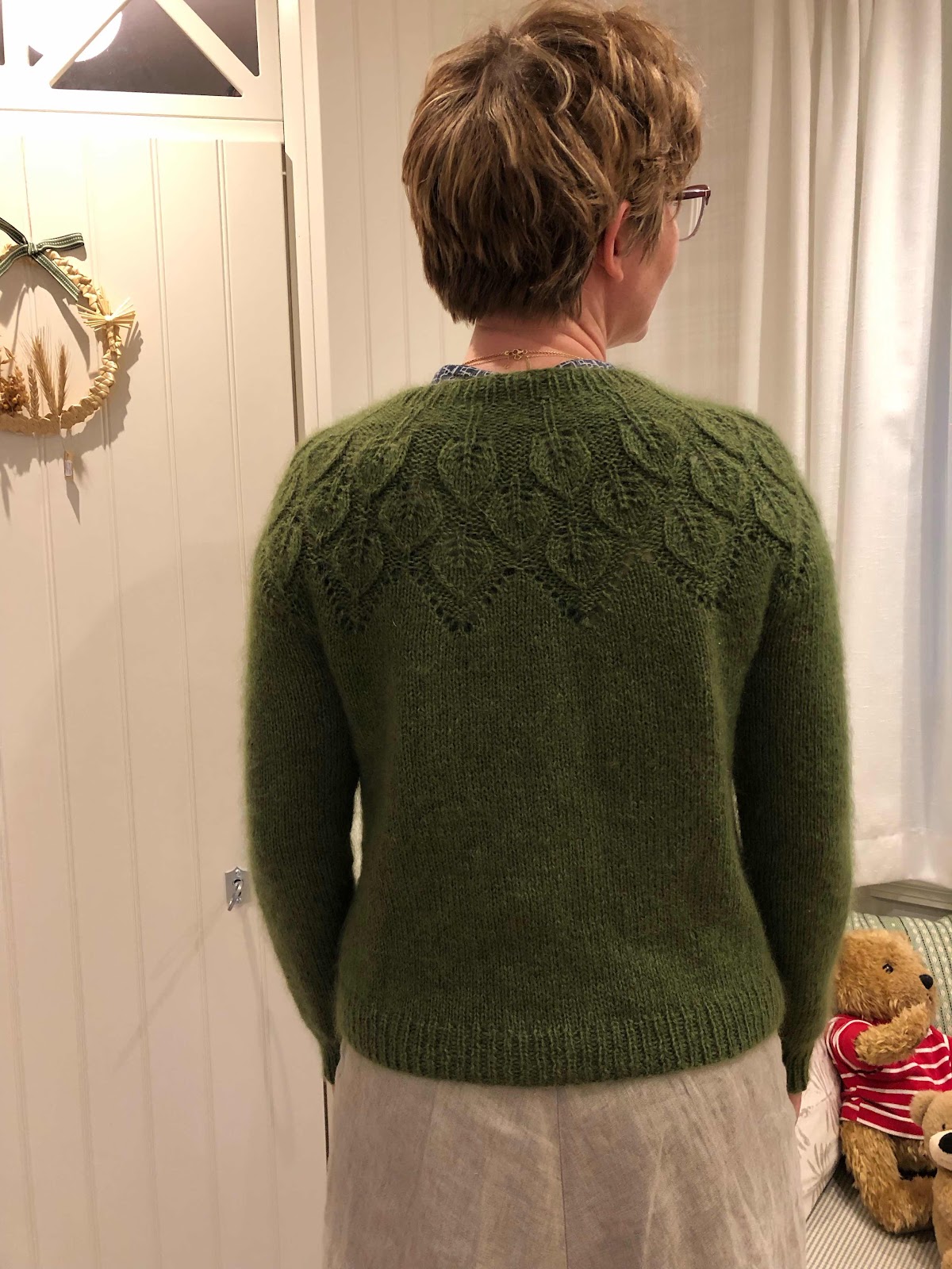 255 g ur lagret. Stickar 3.5 med 3 till kanter. Storlek small, fick 92 i övervidd. Precis lagom. Steekat med 7 masker steek efter halskanten. Så himla mycket enklare.